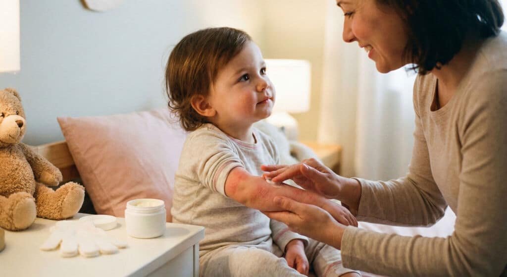 Das tägliche (oft zweimalige) Eincremen des ganzen Körpers ist das Fundament. Nutzt dafür die 3-Minuten-Regel: Badet euer Kind nur kurz (max. 10 Min, lauwarm, mit medizinischem Ölbad statt buntem Schaumbad). Cremt es innerhalb von 3 Minuten nach dem leichten Abtupfen ein, solange die Haut noch klamm ist. So schließt ihr die Feuchtigkeit direkt ein.